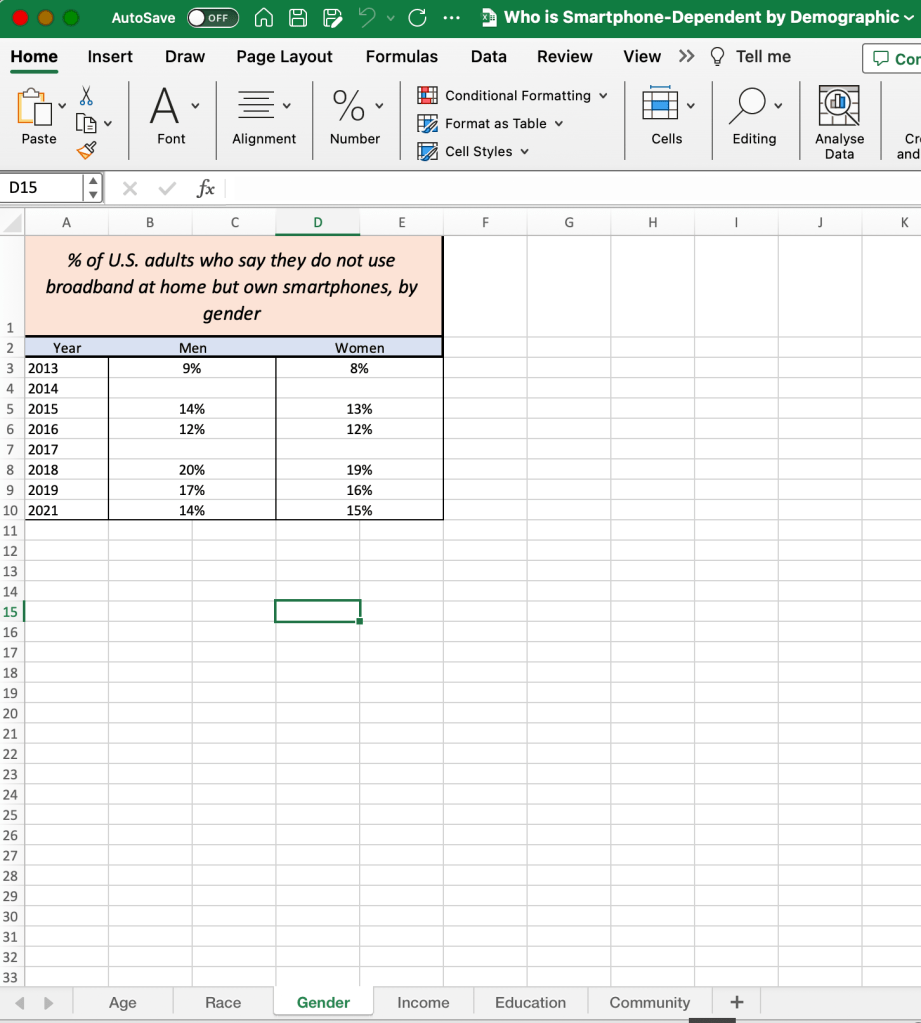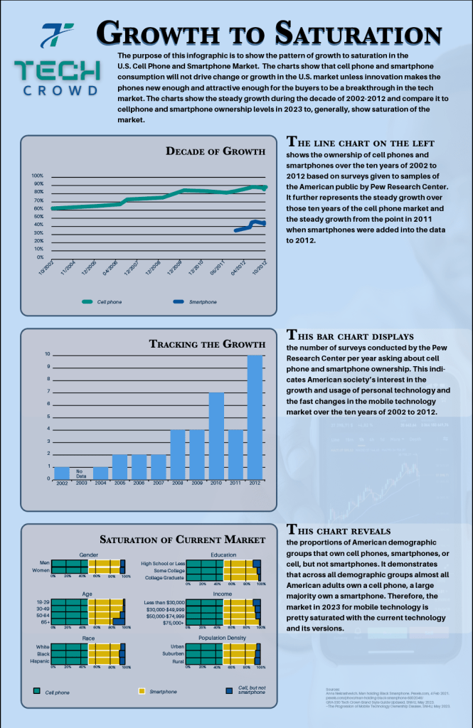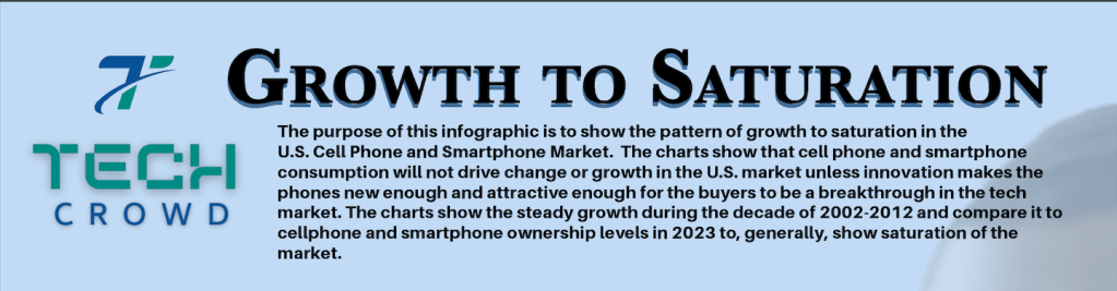 I chose the “The Progression of Mobile Technology Ownership” topic because I like to know about historical trends in technology and wanted to inform others about the topic in an easy way. Moreover, knowing the market is stagnant will affect my future purchases of mobile phones, because there are no real breakthrough changes in the tech recently.