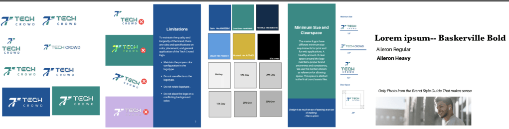 These are the brand colors for the dummy magazine of “Tech Crowd,” the brand fonts plus one I chose (Baskerville), and all the logo do’s and don’t’s I had to follow.
