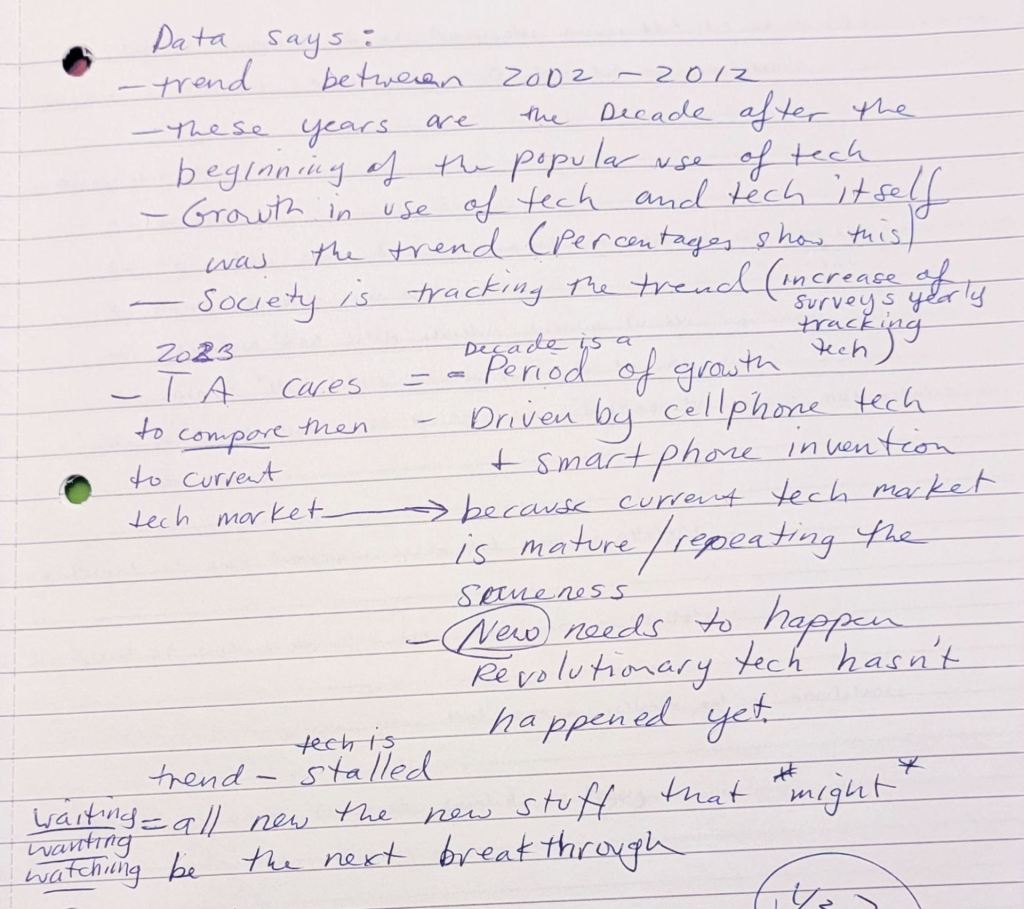 The first page of notes are how the target audience connects with the mission and vision of the magazine and guidance related to how I approached choosing design elements for the target audience. The second page of notes is what I connected to come to an insightful story the target audience wanted to see. The notes were trying to figure out how I could interest the TA in a saturated market.
